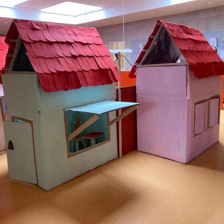 Dachdecker*innen: Die Dachdecker*innen bauten Dachgiebel für die Karton-Kisten-Häuser, dichteten diese Dächer mit Folie wasserfest ab und isolierten sie mit Vlies als Wärmeschutz. Nebenbei wurden auch fleissig Ziegel produziert, welche schliesslich auf die vorbereiteten Dachkonstruktionen geklebt wurden. Die fertigen Dächer konnten nach dem zweiten Arbeitstag auf die bemalten Häuser gesetzt werden. Dies war für die Dachdecker*innen der krönende Abschluss ihrer Arbeit.