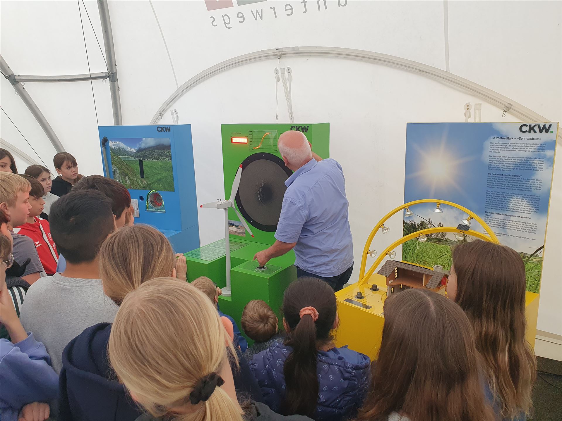 Wir durften einen Mordfall mithilfe von Feuer- und Wassertests aufklären, Pulver analysieren, Zucker verbrennen und etwas über Aggregatszustände lernen. Im MINT-Zelt gab es verschiedene Stationen wie Reaktionsspiele, Doppelkreisel und Spiegellabyrinthe. Unter anderem gab es auch von der CKW Posten mit Wasser-, Wind- und Sonnenenergie. Am Dienstag haben wir von der CKW einen Vortrag hören dürfen, welcher sehr cool und interessant war.