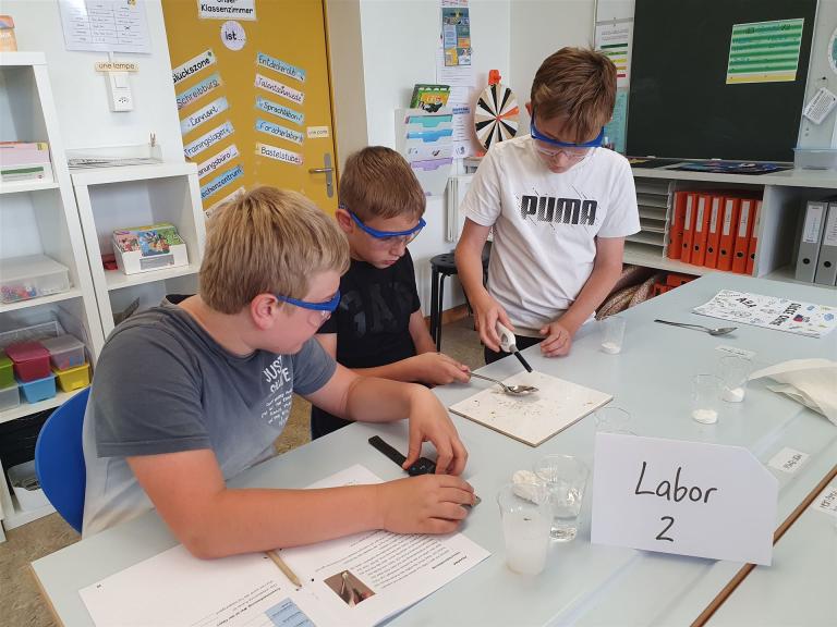 Die 3.-6. Klassen vertieften sich im Themenbereich MINT (Mathematik-Informatik-Naturwissenschaften-Technik). Jede Klasse beschäftigte sich intensiv mit einem dieser Bereiche: Körper, Robotik, Optik, Stoffe – Süsse Chemie, Elektrizität. Zusätzlich war das MINT-Zelt auf der Schulanlage zu Besuch, in welchem beispielsweise Reaktionsspiele, Spiegellabyrinthe oder auch Stationen zur Wasser-, Wind- und Sonnenenergie zur Verfügung standen.