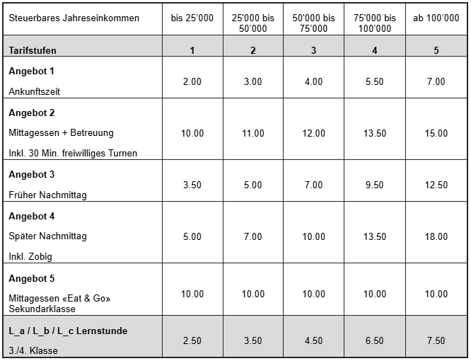 • Kurzfristige Anmeldungen, Änderungen, Wechsel der Betreuung bei weniger als 7 Tagen im Voraus werden mit einem Zuschlag von Fr. 10.00 pro Tag und pro Kind verrechnet. Bei einer Anmeldung von mind. 7 Tagen im Voraus gelten die angegebenen Tarife.